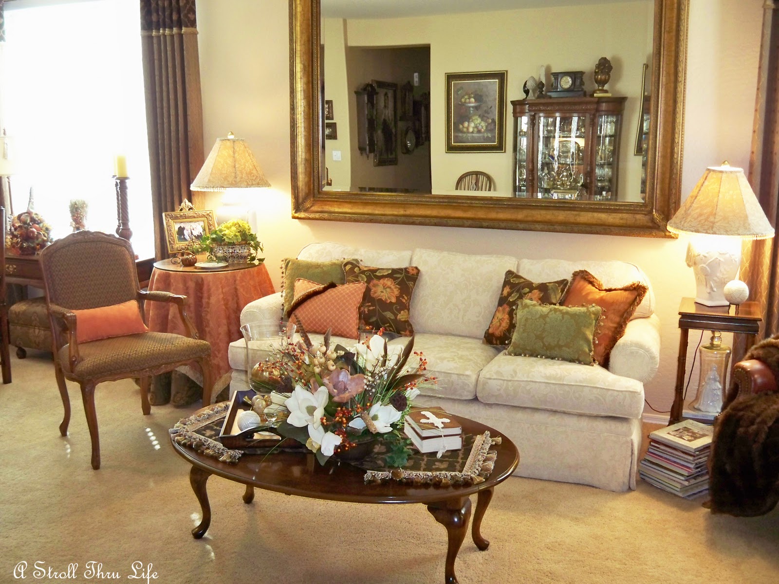 This is my dining room buffet. I love using some of my silver and this really huge cloche is always so fun to play with.